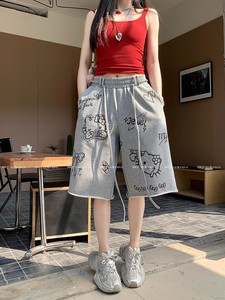 2025 新しい楽しい漫画猫プリントカジュアルパンツ女性の夏のルーズで多用途な痩身ワイドレッグパンツフロアモップパンツ