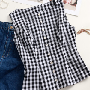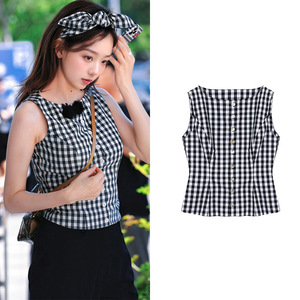 【在庫あり】江燕同風チェック柄ベストショート丈スリムシングルボタン装飾ノースリーブシャツトップス女性用