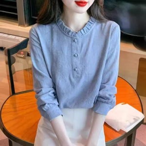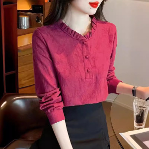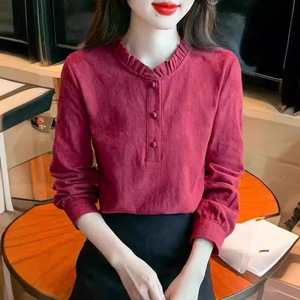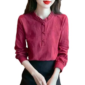 万能ボトムシャツ、スリム長袖春秋新作気質シャツ、蓮の葉襟ジャカード綿麻レディースTシャツ
