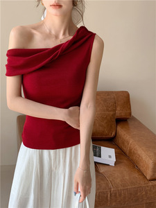 フレンチレトロベスト夏ワンラインカラーオフショルダー多着用14針テンセル通気性不規則トップ