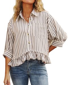 ヨーロッパとアメリカの国境を越えた貿易アマゾンレディースファッション通勤ストライプレース裾ルーズシャツ五分袖シャツ