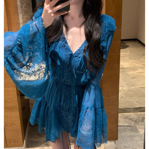 YQGFS (YQGFS) # Yaqiao Xiaomoxia 長袖ピーコックブルーレースドールシフォンシャツ V ネックライト大人スタイルトップスカート