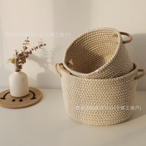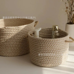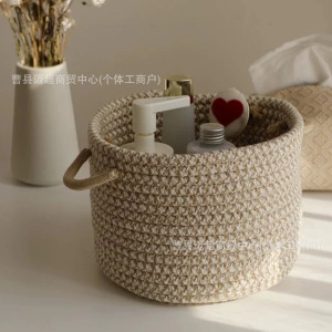 ハンドル付き編み込み収納バスケット化粧品収納ボックスデスクトップラウンド雑貨収納バスケット綿ロープ編みバスケット