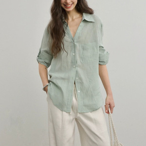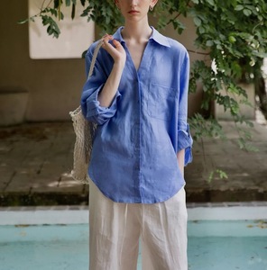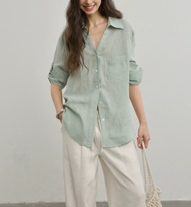 リラックス&カジュアルで快適なVネックリネンシャツ、ゆったりとしたシンプルな日焼け止め長袖シャツ