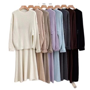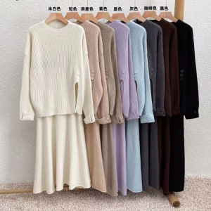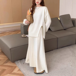 女性のための怠惰なスタイルのセータースーツスカート秋と冬のルーズラウンドネックスプリットセータートップスカートファッションツーピースセット