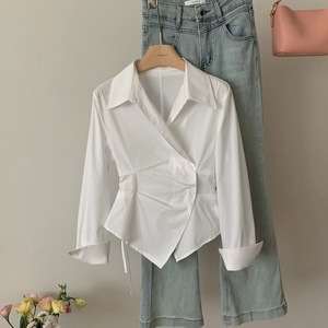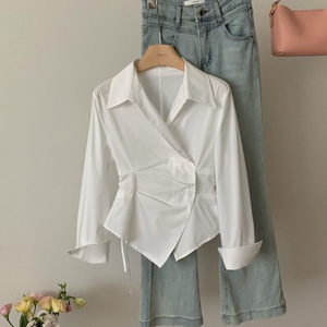 ゆったりとしたスリムなストライプの新しいスタイルのポロカラー単列マルチボタンニッチ長袖トップシャツ女性用