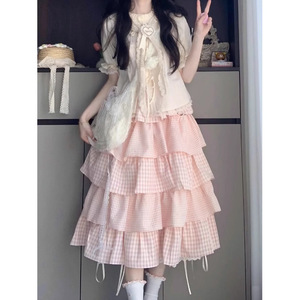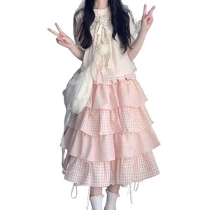 かわいい甘い女の子のドーパミン衣装セット女性の夏のカレッジスタイルのストラップシャツピンクチェック柄ケーキスカート 2 点セット