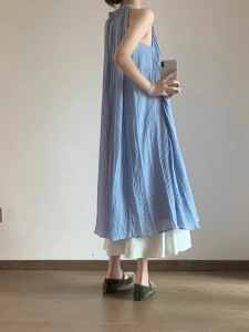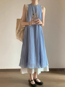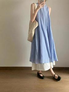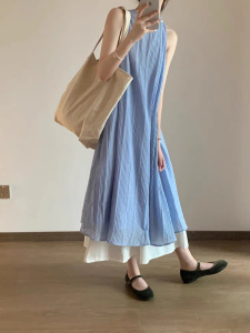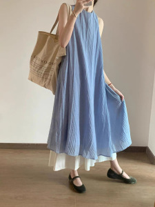 フレンチストライプテクスチャーフェイクツーピースドレス女性の夏の新しいルーズスリムドレープ気質ロングスカート