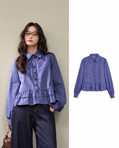 ワイドなブルーのチェック柄シャツ レディース 25 夏の新作 ミュウ系コーデ フリル付き半袖シャツ トップス ショート丈