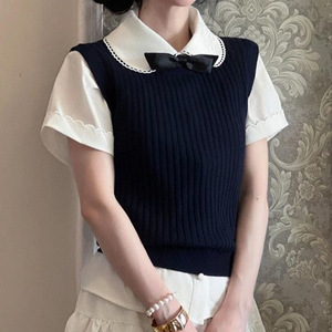 スリーピーススーツ韓国甘いスタイルショートストライプベスト女性用+ラペル半袖シャツ+白スカート