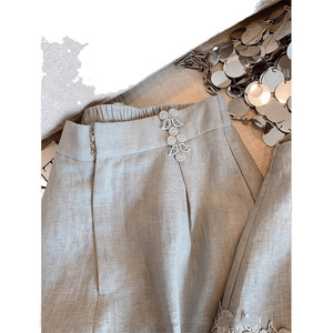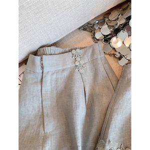 ブルー立体レース刺繍リネンツーピーススーツ女性のための夏の新しい中国風のノースリーブシャツ + ショーツの完全なセット