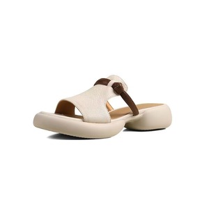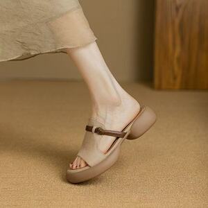 女性用厚底ソフトレザーソフトソールサンダル、本革アウターウェア、太ヒールスリッパ、夏用オープントゥカラーブロックフェアリースリッパ