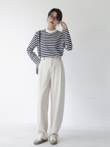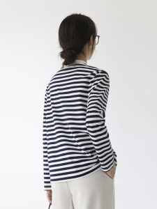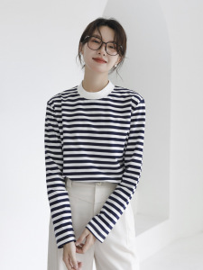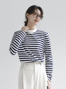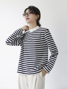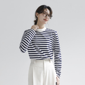 純綿ソフトワックスストライプ長袖レディースTシャツハーフハイカラールーズスリムカジュアルアウターウェアクラシックシーソウルボトムファーウッド
