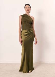 180gのミルクシルクと高弾性サテン生地を使用。斜め肩のシャーリング切り替えデザイン。