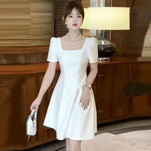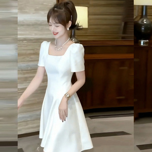 年齢を減らすガーリースタイルの白いプリンセスドレス、小さなウエスト、甘いパフスリーブ、女性の夏用フレンチドレス