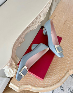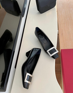 R パテントレザー カーフスキン メタル スクエア バックル ハイヒール スクエア フラット ヘッド 太いミディアム ヒール 幾何学的なスクエア ヒール エレガントな小さな靴