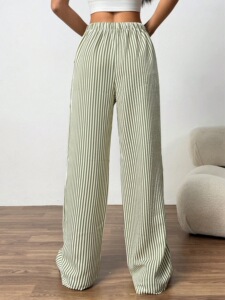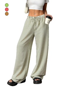クロスボーダーレディースストライプワイドパンツ、ドレープ感のあるロングパンツ、春夏レディースパンツ、ローウエストパンツ