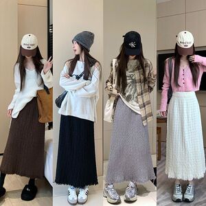 褶皱肌理感针织半身裙女秋冬新款毛边流苏a字伞裙高腰显瘦包臀裙