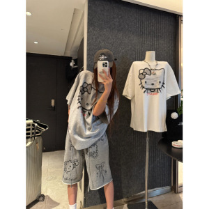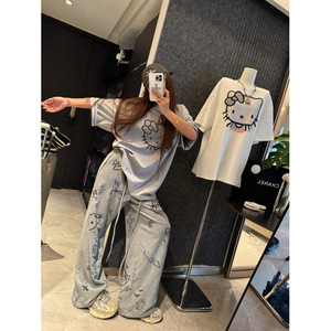 グレー漫画 kt 猫プリント怠惰なストレートスリムカジュアルパンツ女性のルーズワイドレッグロングパンツ夏の新スタイル
