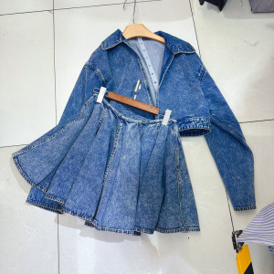 Thirteen Lines オーストラリアン ニッチ ファッショナブル リラックス スノーフレーク ウォッシュ デニム ジャケット + プリーツ スカート セット C1 # 2201