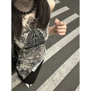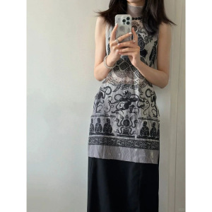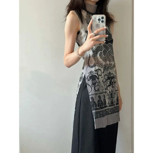 新しい中国風のレトロなプリントデザインの軽量メッシュスリットベスト女性の夏のホットガール痩身ハーフタートルネックトップ