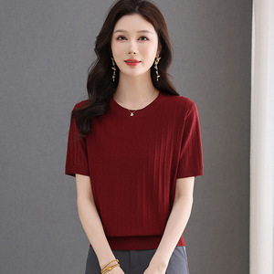 アイスシルクセーター半袖Tシャツ中年母親向け、おしゃれな夏服2025新作夏薄いお腹カバートップ