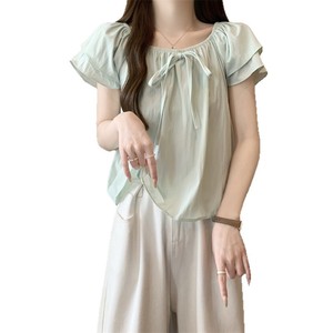 女性用のボウタイ付きルーズオフショルダー半袖シャツ、夏用フレンチミントグリーンシャツ、肉感をカバーし、スリムに見えるトップス