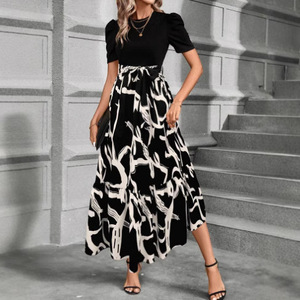 2025クロスボーダー女装春夏服起爆花柄プリント丸襟ワンピース異域リゾート風優雅ワンピース