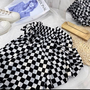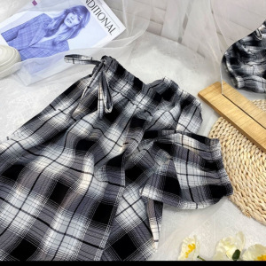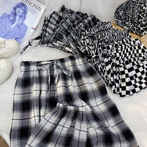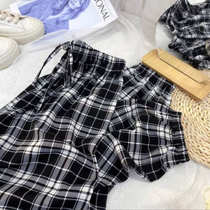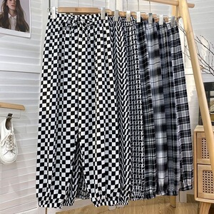 黒と白のチェック柄プリントアイスシルクシフォンブルマ女性の夏のルーズカジュアルワイドレッグ日焼け止めキャロットハーレムパンツ