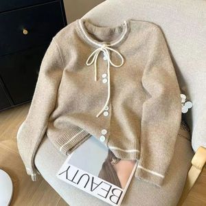 春と秋の女性用フレンチレースアップリボンニットカーディガン、優しい気質、ゆったりとした香りのセーター、ボトリングシャツトップ