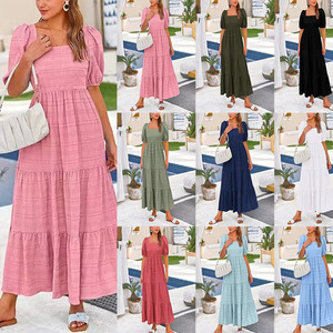 2024 ヨーロッパとアメリカの貿易クロスボーダー婦人服アマゾンエレガントなスタイルのスクエアネック弾性ウエストプリーツロングレディースドレス