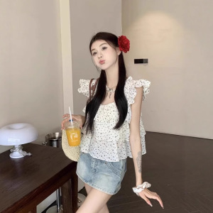 黒のスクエアネック小さなフライングスリーブ花柄ベビードールシャツ女性の夏のフレンチデザインショートノースリーブTシャツトップ