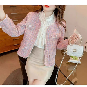 法式小香风春秋款外套粉色韩版小个子外套粗花呢宽松上衣气质名媛