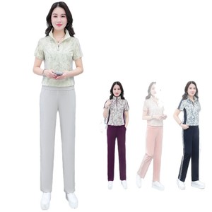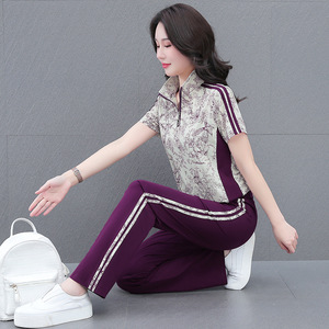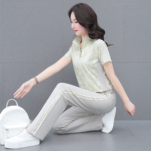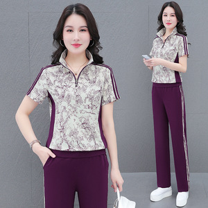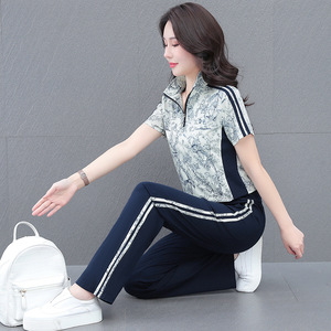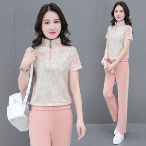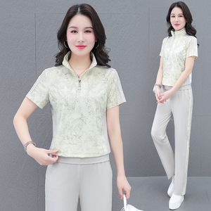 母の日ママスポーツウェア女性のための 2025 夏の新しいプリントファッショナブルなスタンドカラー半袖ズボン