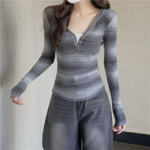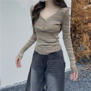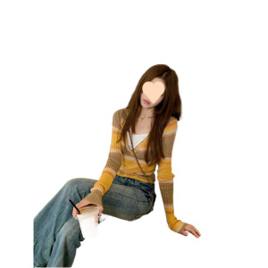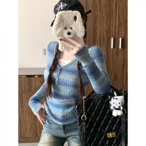 コントラストカラーストライプ襟長袖セーターレディース秋冬新作インナーレイヤリングセータースリムフィットホットガールトップ