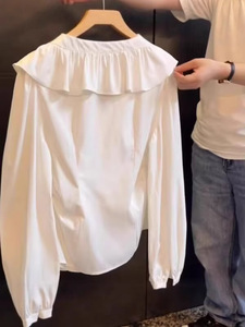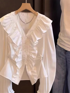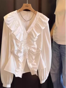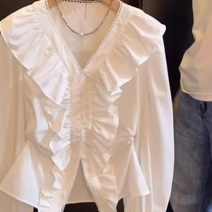 フレンチスタイルの優しく年齢を軽減する気質シャツ、白いVネックフリルステッチデザイン、ウエスト痩身長袖シャツ