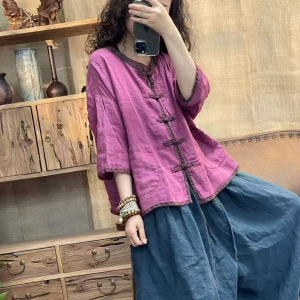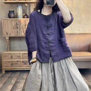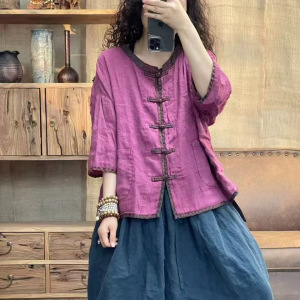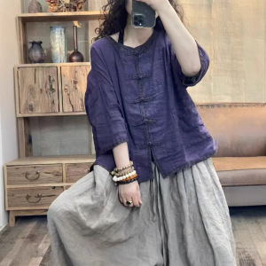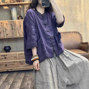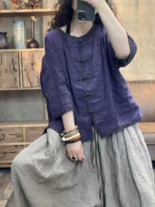 文学レトロスタイルサンドウォッシュリネンスタンドカラーボタンパッチポケット七分袖シャツ女性のための 2025 夏多用途トップ
