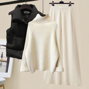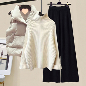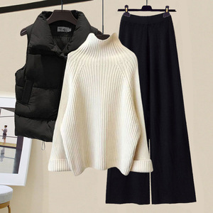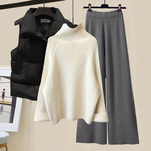 冬季穿搭一整套2025新款洋气棉服马甲高领毛衣女显瘦阔腿裤三件套