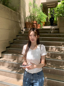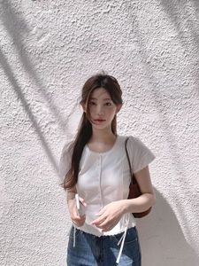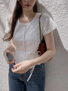 スポット 2025 夏の新スタイル韓国東大門スリムフィットウエストレースアップスリムレースラウンドネック半袖シャツ