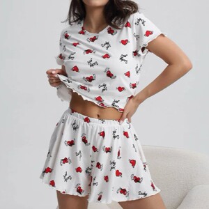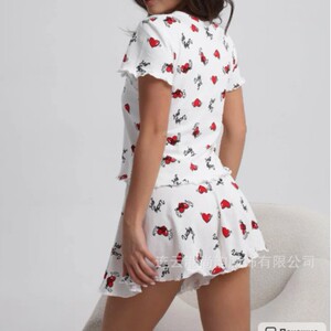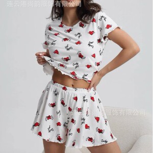 クロスボーダー女性用ホームウェア、ホームパジャマ、屋外で着用可能、ラブプリントサスペンダーショーツ、2点セット、ミルクシルク工場
