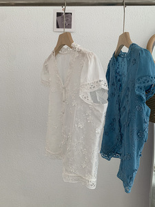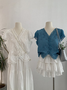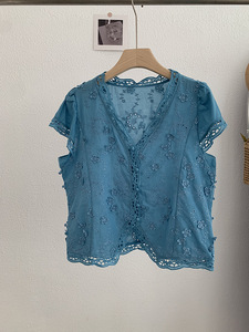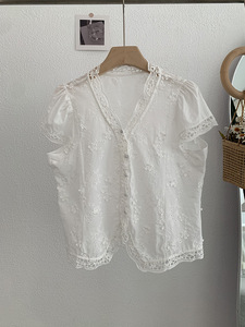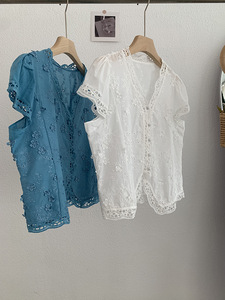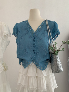 欧瑪莱の波vネックの透かし彫りの刺繍の立体の小さい花の半袖のシャツの夏の新型の復古の上着の3525