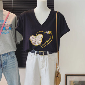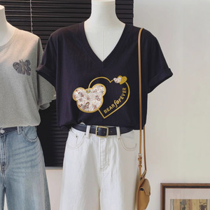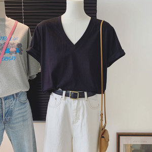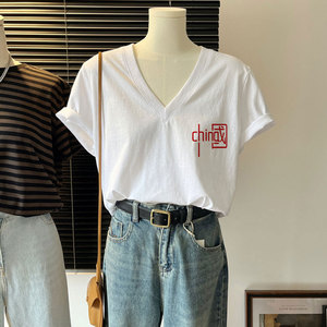 ヨーロッパ綿 V ネック半袖 T シャツ女性のための 2025 新しい夏のニッチデザイン西洋スタイルユニークでシックなトップ服