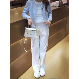 早春穿搭一整套女条纹撞色假两件针织衫显腿长直筒牛仔裤潮