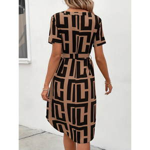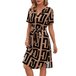 クロスボーダーヨーロッパとアメリカの気質の軽くて大人な半袖チェック柄ドレス夏休みベルト付きVネックAラインミドル丈スカート