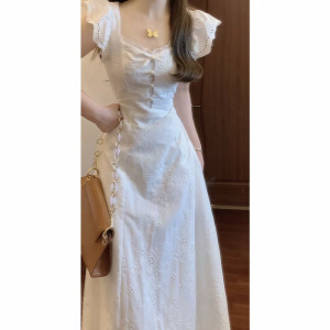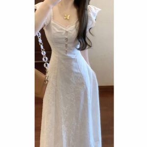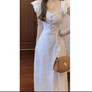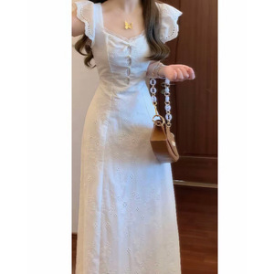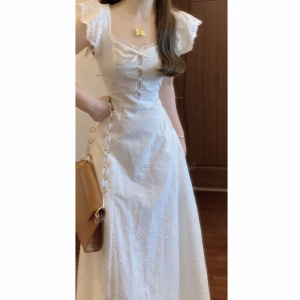 フレンチホワイトムーンライトレース中空刺繍スクエアネックドレス小さなフライングスリーブウエスト小さな白いドレス気質ロングドレス