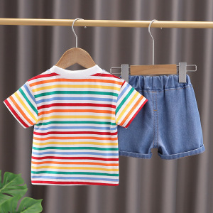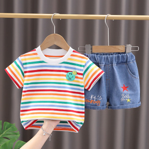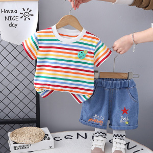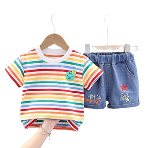 ボーイズ Tシャツ 2025 夏の新ボーイズコットンカラーストライプベビーボーイズショーツ漫画カジュアルツーピーススーツ