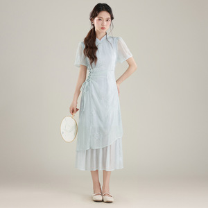 女性の2025年夏新作13ライン新中国風セレブフェイクツーピース改良チャイナドレスウエストロングスカート