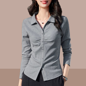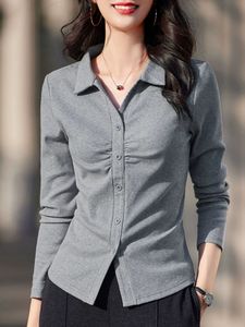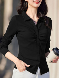 ポロ襟長袖 Tシャツ女性の秋の新作 2025 ラペル無地ボタンプリーツ多用途ボトリングシャツトップ