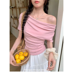 卸売 [7 色] 甘くてスパイシーなフレンチスタイルのワンショルダー T シャツ女性の夏のプリーツ痩身ショートトップ