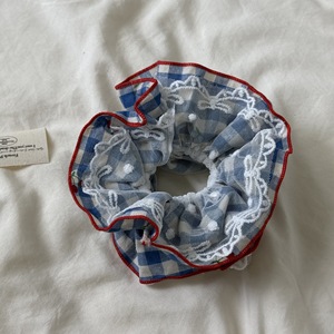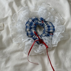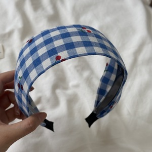 ネイビーブルーチェリーチェック柄レースリボンラブヘアバンド韓国風フレッシュで万能な女の子用つば広ヘアバンド